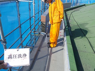 マンションの高圧洗浄を行う際に飛散等が無いようにカーシートなどに気を付けて行いました。