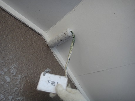 - 軒天井下塗り:塗料が密着不良にならないよう、丁寧に塗布していきます